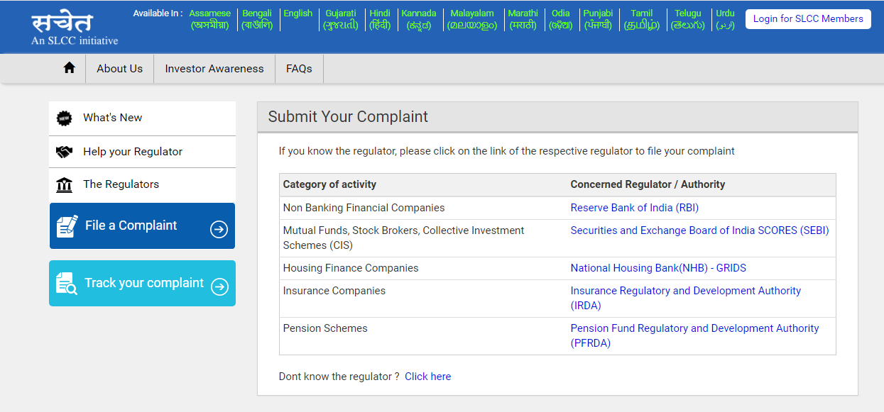 However, in order to get faster resolution of your complaint, it is advised that you may chose the concerned regulator if you are aware about the same.