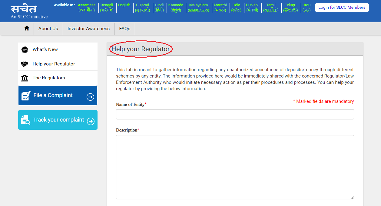 This website is meant to gather information regarding any unauthorized acceptance of deposits/money through various schemes by suspect entities so that action could be initiated against them. In case you have noticed any suspect activity such as unauthorized acceptance of deposits/money under different schemes, the same can be brought to the notice of the regulators by clicking on the “Help your Regulator” tab. You could also attach documents/pictures to support your information.The information submitted by you will be examined and used for further action